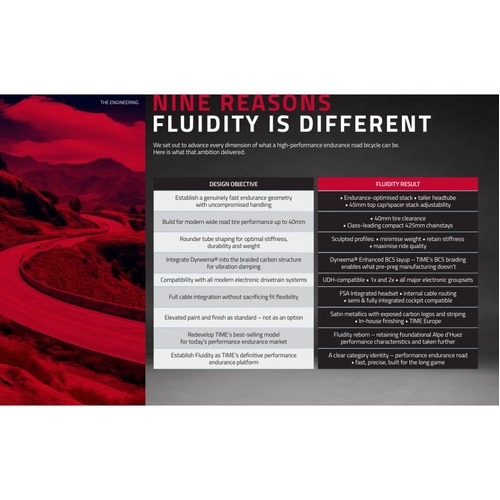 - Here, in the heart of Europe, we’ve been busy merging those memories of bikes that have delivered us to this point in time, before taking a ride into the future. We remember those epic days in the saddle, crossing windswept roads and taking a detour onto the path that flows alongside the Danube, delivering you into the urban expanse of Vienna, where history meets modernity. Ultimately, cycling is about effortless pedaling that is driven by emotions, and a natural synergy between bike and rider – a passion for exploration. The new Fluidity takes you on a journey into the future of endurance bikes, whilst keeping one eye on the road taken to arrive at this point. Performance and comfort in perfect harmony – only from TIME.