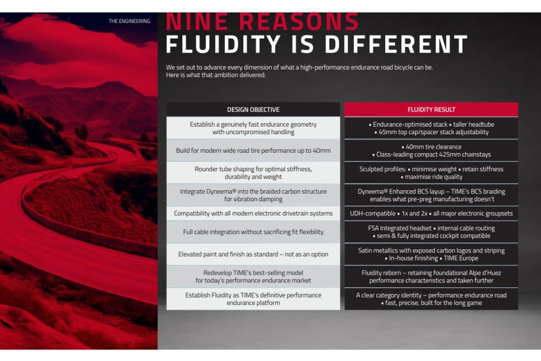 - Here, in the heart of Europe, we’ve been busy merging those memories of bikes that have delivered us to this point in time, before taking a ride into the future. We remember those epic days in the saddle, crossing windswept roads and taking a detour onto the path that flows alongside the Danube, delivering you into the urban expanse of Vienna, where history meets modernity. Ultimately, cycling is about effortless pedaling that is driven by emotions, and a natural synergy between bike and rider – a passion for exploration. The new Fluidity takes you on a journey into the future of endurance bikes, whilst keeping one eye on the road taken to arrive at this point. Performance and comfort in perfect harmony – only from TIME.