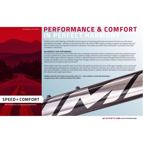 - Fluidity is optimised for road tire sizes up to 40mm. This is not simply a concession to comfort but rather a performance decision, supported by a growing body of evidence from professional cycling and reflected in the choices of every major race team in the peloton.