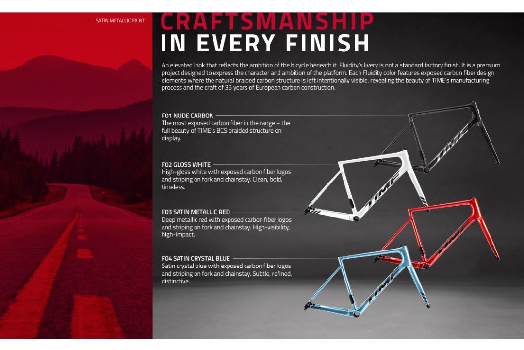 - An elevated look that reflects the ambition of the bicycle beneath it, each Fluidity color features exposed carbon fiber design elements where the natural braided carbon structure is left intentionally visible, revealing the beauty of TIME’s manufacturing process and the craft of 35 years of European carbon construction.