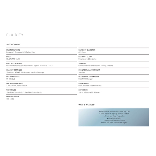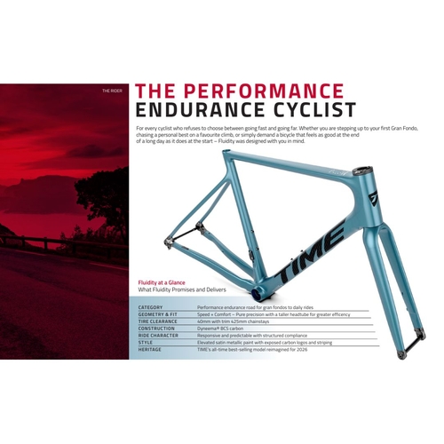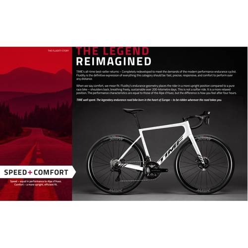 - Here, in the heart of Europe, we’ve been busy merging those memories of bikes that have delivered us to this point in time, before taking a ride into the future. We remember those epic days in the saddle, crossing windswept roads and taking a detour onto the path that flows alongside the Danube, delivering you into the urban expanse of Vienna, where history meets modernity. Ultimately, cycling is about effortless pedaling that is driven by emotions, and a natural synergy between bike and rider – a passion for exploration. The new Fluidity takes you on a journey into the future of endurance bikes, whilst keeping one eye on the road taken to arrive at this point. Performance and comfort in perfect harmony – only from TIME.