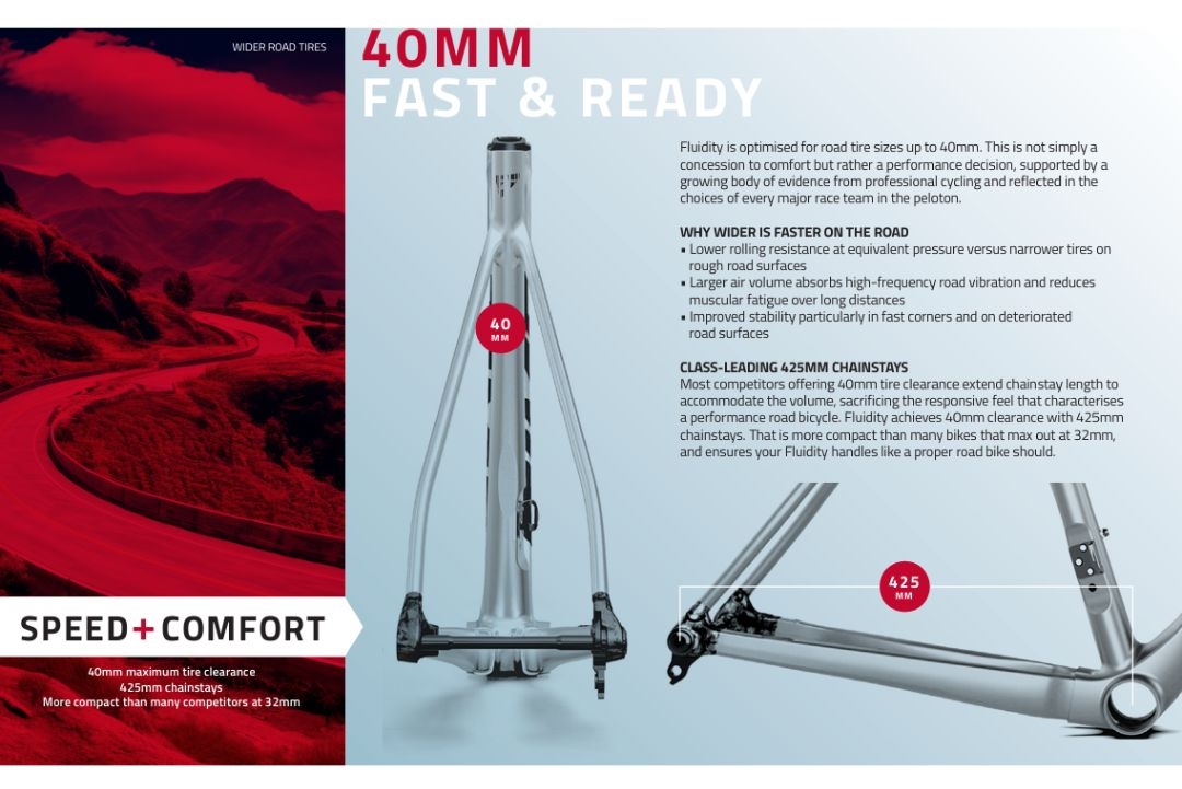 - Fluidity is optimised for road tire sizes up to 40mm. This is not simply a concession to comfort but rather a performance decision, supported by a growing body of evidence from professional cycling and reflected in the choices of every major race team in the peloton.
