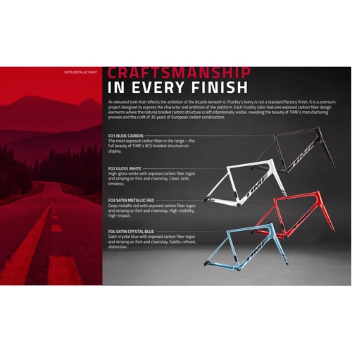 - An elevated look that reflects the ambition of the bicycle beneath it, each Fluidity color features exposed carbon fiber design elements where the natural braided carbon structure is left intentionally visible, revealing the beauty of TIME’s manufacturing process and the craft of 35 years of European carbon construction.