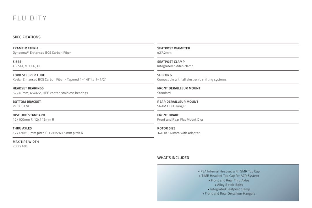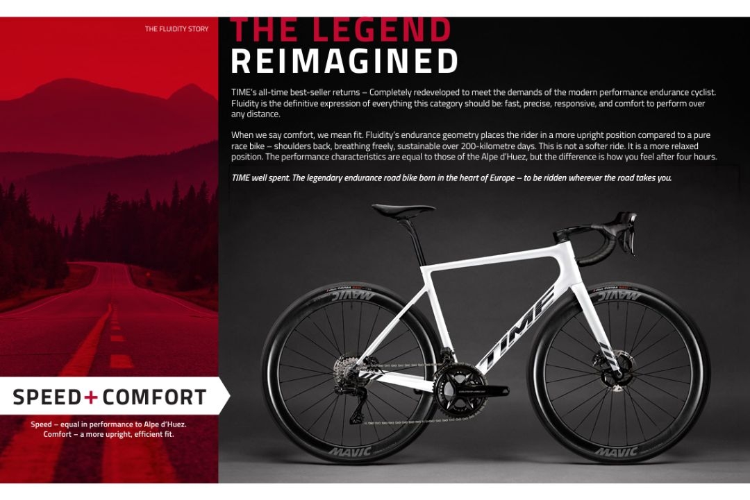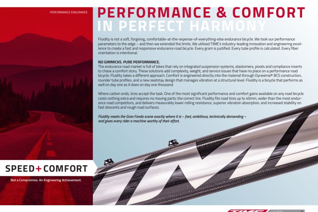 - Here, in the heart of Europe, we’ve been busy merging those memories of bikes that have delivered us to this point in time, before taking a ride into the future. We remember those epic days in the saddle, crossing windswept roads and taking a detour onto the path that flows alongside the Danube, delivering you into the urban expanse of Vienna, where history meets modernity. Ultimately, cycling is about effortless pedaling that is driven by emotions, and a natural synergy between bike and rider – a passion for exploration. The new Fluidity takes you on a journey into the future of endurance bikes, whilst keeping one eye on the road taken to arrive at this point. Performance and comfort in perfect harmony – only from TIME.