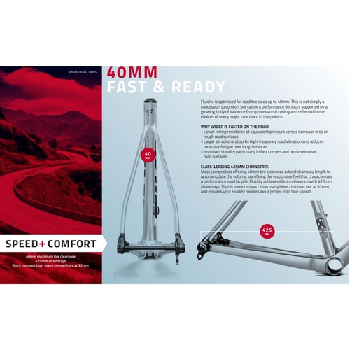 - Fluidity is optimised for road tire sizes up to 40mm. This is not simply a concession to comfort but rather a performance decision, supported by a growing body of evidence from professional cycling and reflected in the choices of every major race team in the peloton.