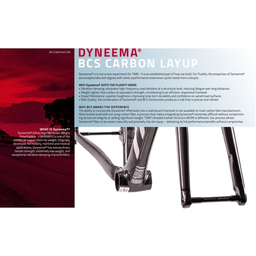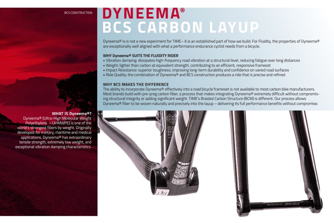 - Most brands build with pre-preg carbon fiber, a process that makes integrating Dyneema® extremely difficult. TIME’s Braided Carbon Structure (BCM) is different. Our process allows Dyneema® fiber to be woven naturally and precisely into the layup – delivering its full performance benefits without compromise.